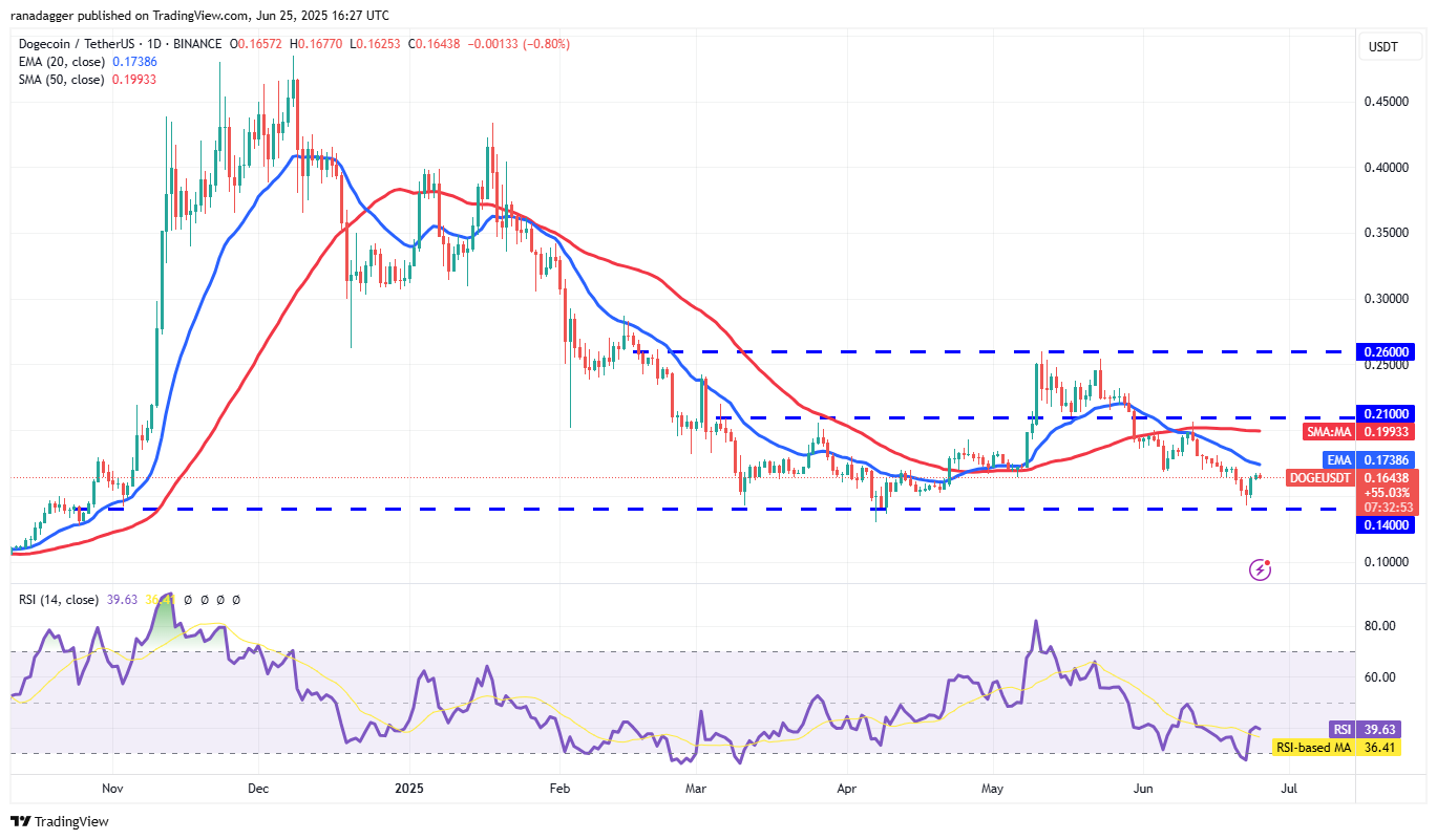 Dogecoin (DOGE) rebounded off the $0.14 support on Sunday, but the relief rally may face selling at the 20-day EMA ($0.17).