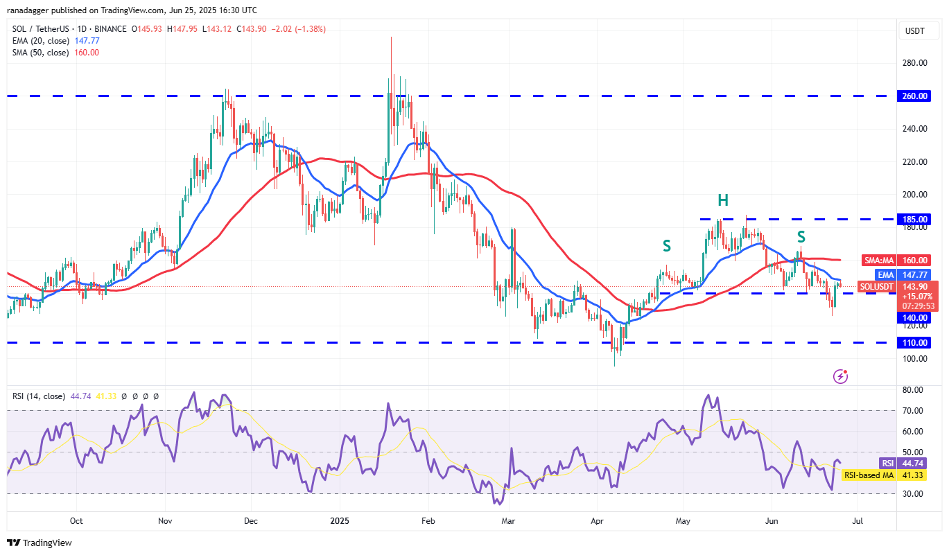 The recovery is facing selling at the 20-day EMA ($147), but a positive sign is that the bulls have not allowed the price to slide below $140. A shallow pullback increases the possibility of a break above the 20-day EMA. If that happens, the SOL/USDT pair could climb to the 50-day SMA ($160).