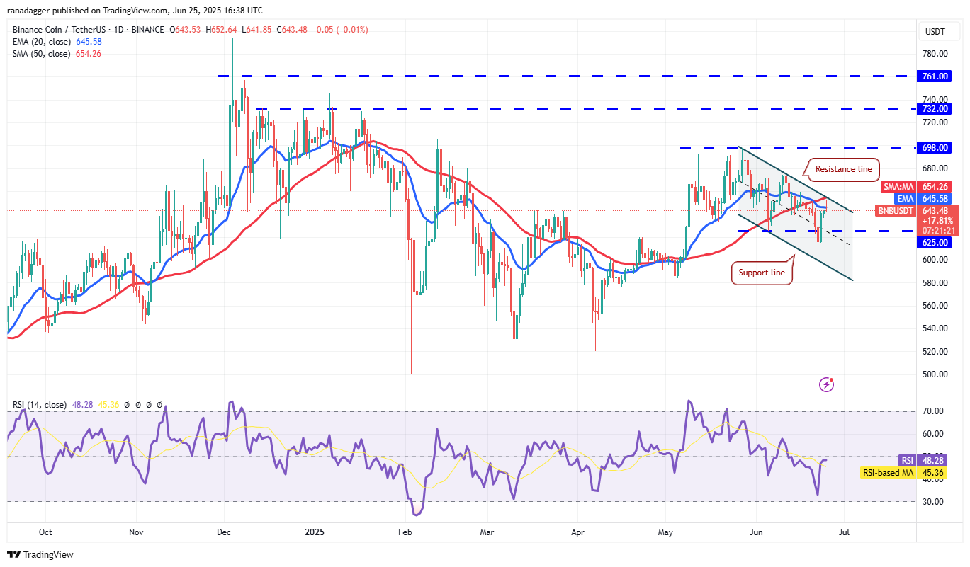If buyers do not give up much ground from the resistance line, the prospects of a break above the channel improve. The BNB/USDT pair could ascend to $675 and, after that, to $698.