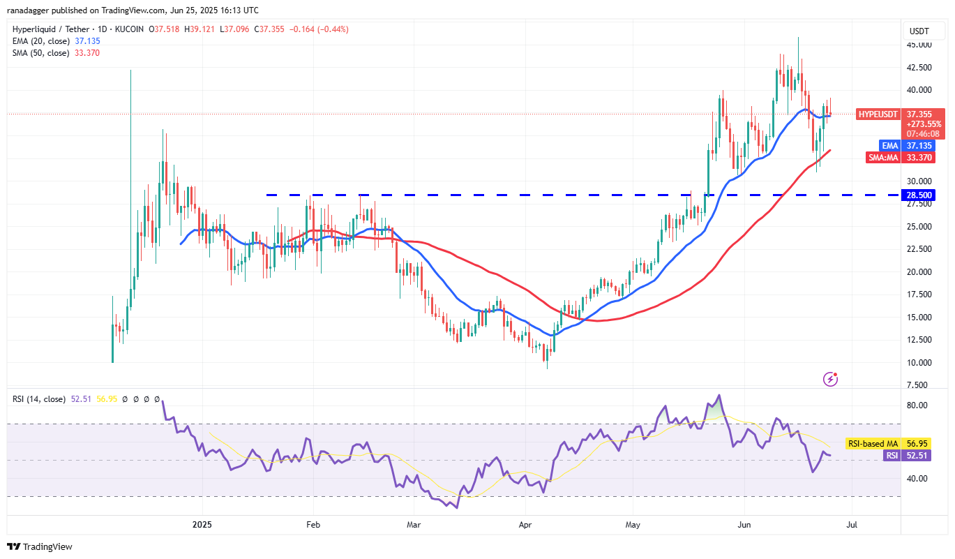 Hyperliquid (HYPE) rebounded off the 50-day SMA ($33.37) on Monday and rose above the 20-day EMA ($37.13).