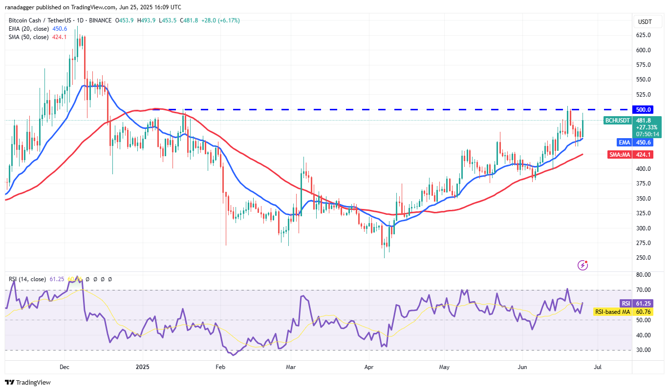 Bitcoin Cash (BCH) turned up from the 20-day EMA ($450) on Wednesday, indicating that lower levels continue to attract buyers.