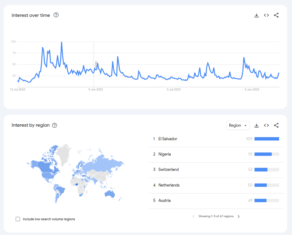 Data from Google Trends shows a modest uptick in search activity for “Bitcoin” over the past two weeks, but compared to five-year historical data, mainstream “FOMO” is distinctly lacking.