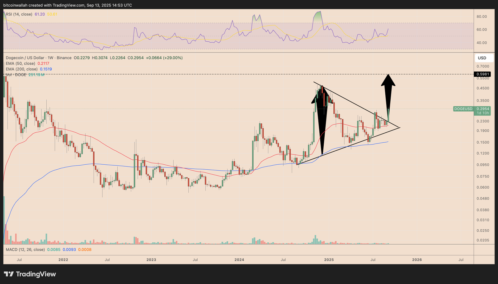 The weekly DOGE price chart shows a breakout from a multimonth symmetrical triangle, a bullish continuation pattern.