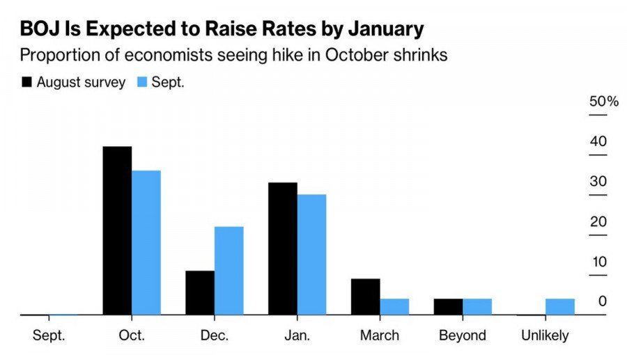 In theory, political uncertainty means a delay in the next overnight rate hike. The Prime Minister’s resignation allowed Barclays to postpone its forecast for the next tightening from October to January. Nevertheless, 36% of Bloomberg’s experts still expect tightening in mid-autumn—this is the most popular view, even though the share has fallen from 43%.
