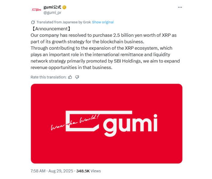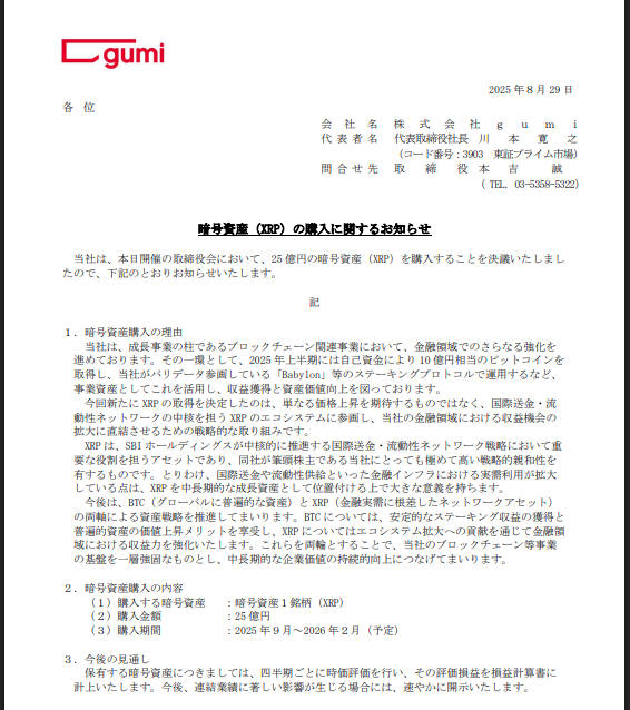 According to a press release, the acquisition will not be a single purchase. Instead, Gumi will buy XRP gradually from September 2025 through February 2026.